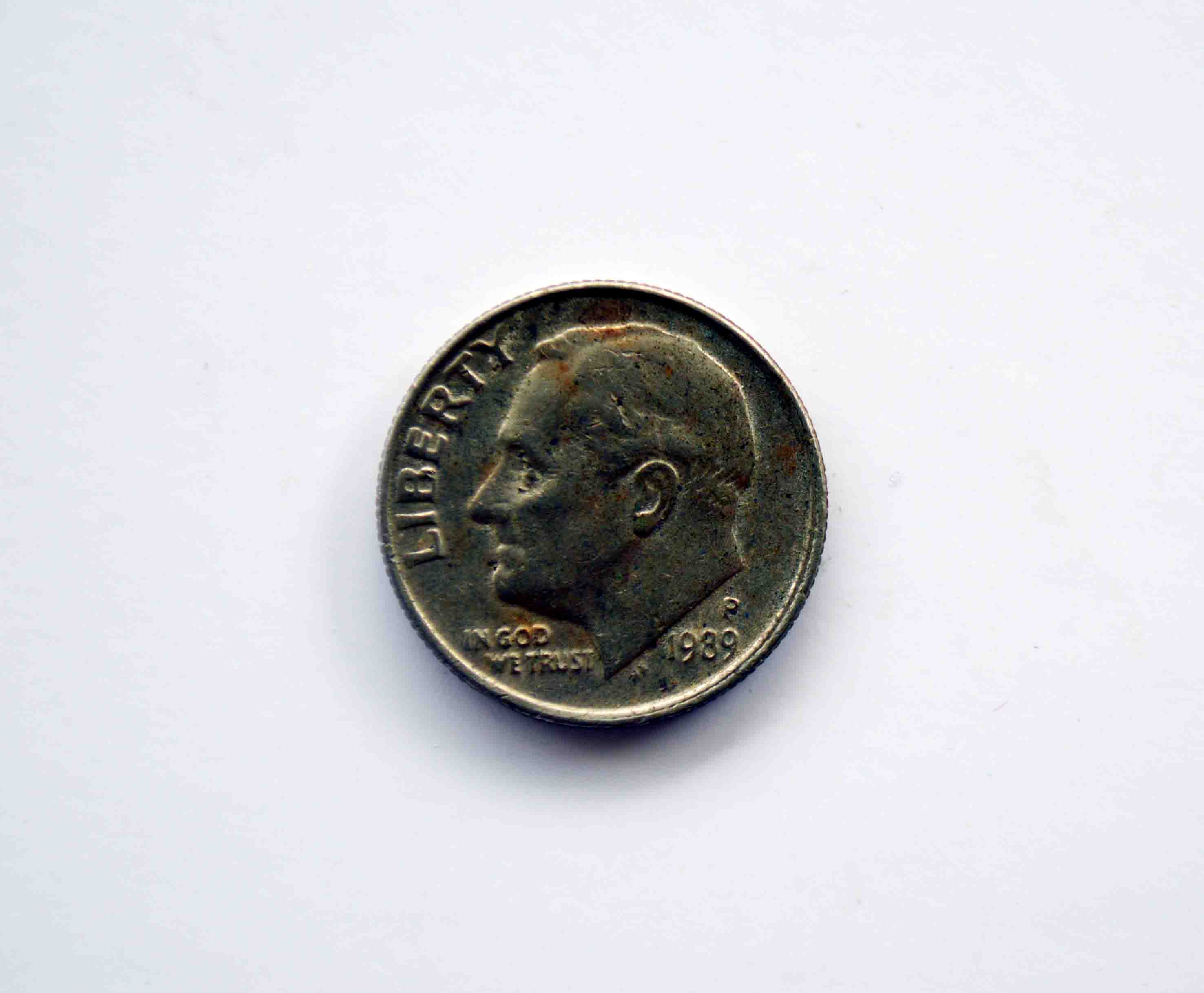 1989 USA dimes (Roosevelt design, 2.27g, copper-nickel clad) are very common, with over 2.1 billion minted in Philadelphia (P) and Denver (D) combined. Most circulated coins are worth face value ($0.10), while uncirculated examples generally sell for $0.30–$2.00. High-grade specimens (\(MS68\)+) can exceed $500.